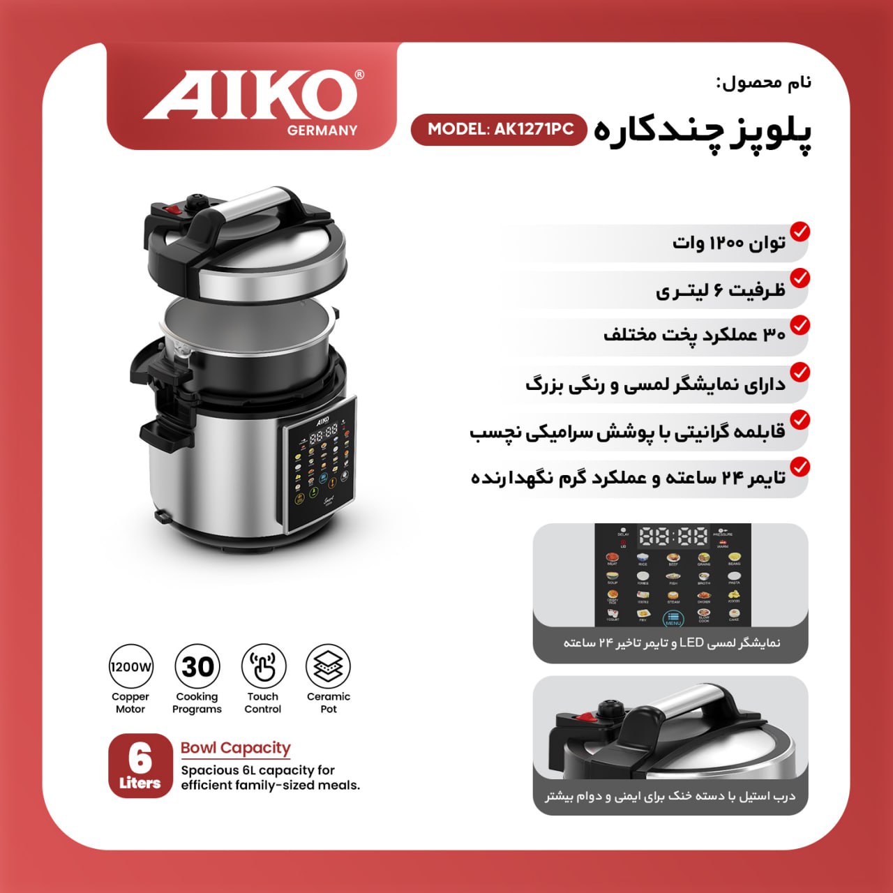 پلوپز چند کاره ایکو مدل AK1271PC با طراحی زیبا و کاربردی و توان ۱۲۰۰ وات، دارای ۳۰ عملکرد پخت مختلف است و با قابلمه گرانیتی و پوشش سرامیکی نچسب تمام ویژگی های یک دستگاه همهکاره و کاربردی برای هر آشپزخانهای را ارایه داده است. طراحی زیبا و مدرن، صفحه نمایش لمسی رنگی بزرگ، ، تایمر ۲۴ ساعته، و عملکرد گرم نگهدارنده غذا، تنها بخشی از ویژگیهای برجسته این دستگاه هستند. با داشتن این پلوپز چند کاره، نه تنها زمان آشپزی شما کاهش مییابد، بلکه میتوانید از پخت غذاهای متنوع و خوشمزه لذت ببرید. این پلوپز با توجه به طراحیاش، از ایمنی و دوام بالایی برخوردار است. درب استیل با دستههای خنک، از سوختگیهای احتمالی جلوگیری میکند و استفاده از دستگاه را برای همه اعضای خانواده ایمن میکند. اگر به دنبال دستگاهی هستید که همزمان با سادگی و سرعت، کیفیت، زیبایی و تنوع را به آشپزخانه شما بیاورد، پلوپز چند کاره ایکو مدل AK1271PC یک انتخاب ایدهآل برای شماست.