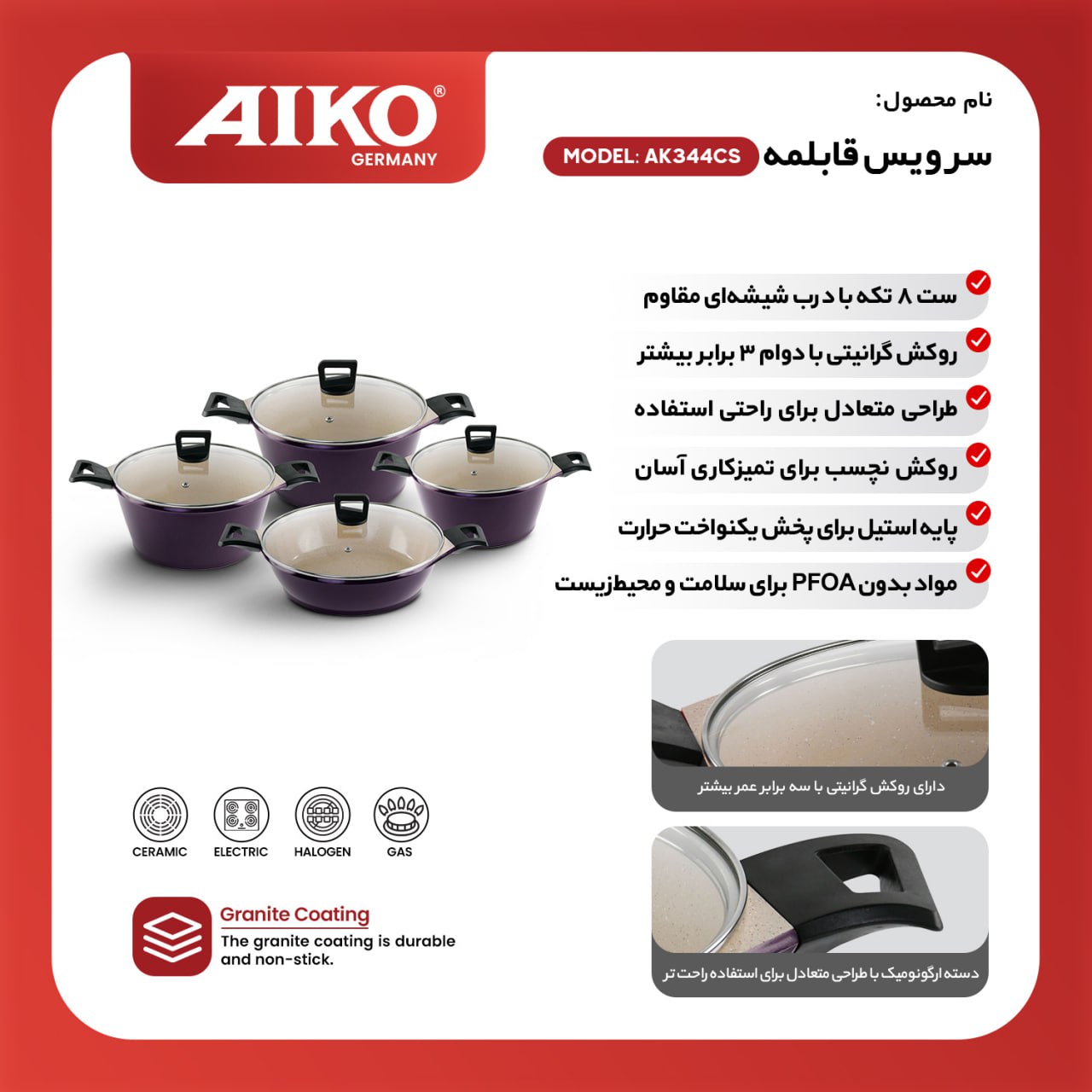| ویژگی ها | مواد بدون PFOA برای سلامت و محیط زیست، طراحی متعادل برا استفاده راحت |